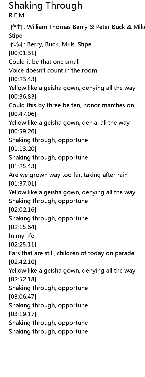 | [00:00.00] | zuò qǔ : William Thomas Berry Peter Buck Mike Mills Michael Stipe |