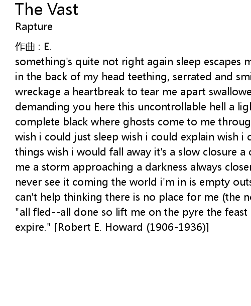 | something' s quite not right again sleep escapes me, far away you' re the whisper in the back of my head teething, serrated and smiling kneedeep in this hopeless wreckage a heartbreak to tear me apart swallowed by the vast, allconsuming demanding you here this uncontrollable hell a lightless abode a sleepless complete black where ghosts come to me through every hole in each and every wall wish i could just sleep wish i could explain wish i could change the way of things wish i would fall away it' s a slow closure a cold shape crawling behind me a storm approaching a darkness always closer i ever thought it could can never see it coming the world i' m in is empty outside i think i choke somehow i can' t help thinking there is no place for me the noise in my head won' t leave " all fledall done so lift me on the pyre the feast is over and the lamps expire." Robert E. Howard 19061936 |