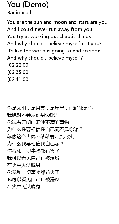 | [02:47.00][02:22.00] | You me and everything caught in the fire |
