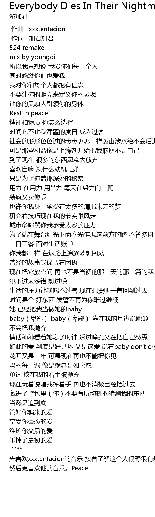 | [02:18.00] | 先喜欢xxxtentacion的音乐 接着了解这个人很野很有想法 然后更喜欢他的音乐。Peace |