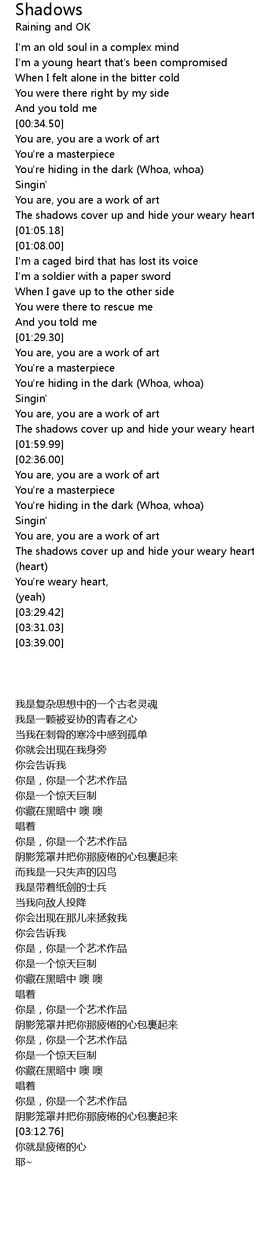 The shadows cover up and hide your weary heart |