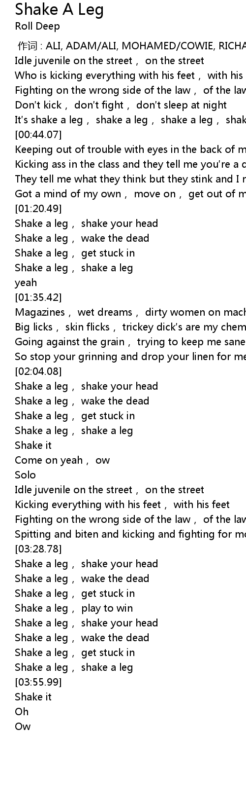 | [00:37.46] | It s shake a leg, shake a leg, shake a leg, shake it yeah |