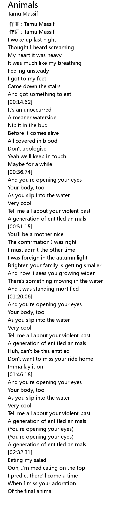 | [00:00.355] | 作词 : Tamu Massif |