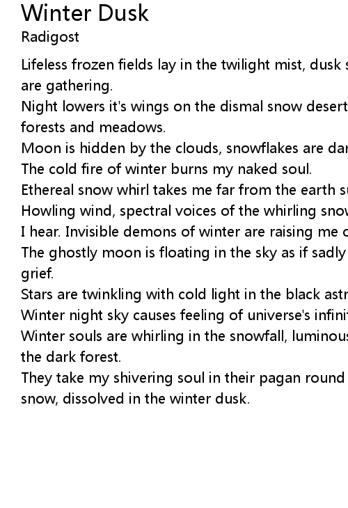 | They take my shivering soul in their pagan round dance, lost in the curtain of snow, dissolved in the winter dusk. |