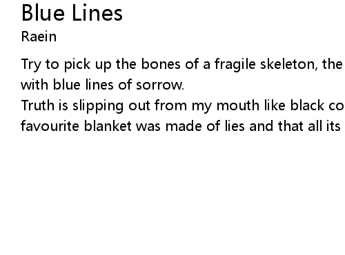| Truth is slipping out from my mouth like black cold water. Now I know that my favourite blanket was made of lies and that all its warm was just denial. |