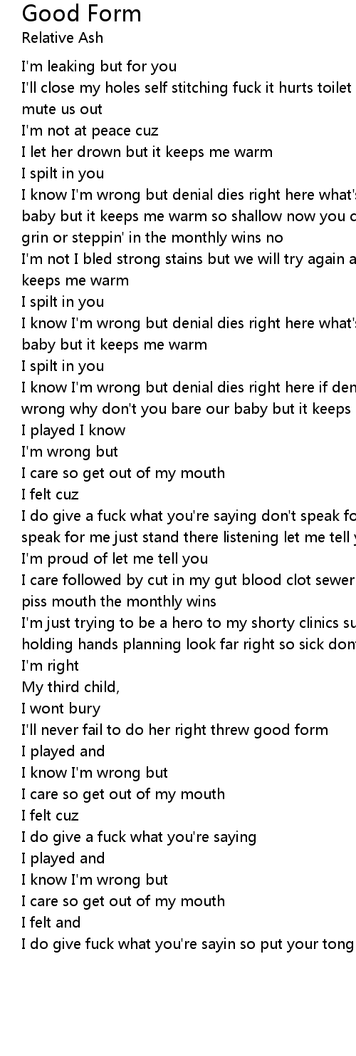 I know I'm wrong but denial dies right here what's wrong why don't you share our baby but it keeps me warm so shallow now you choose but don't show teeth sweet grin or steppin' in the monthly wins no |