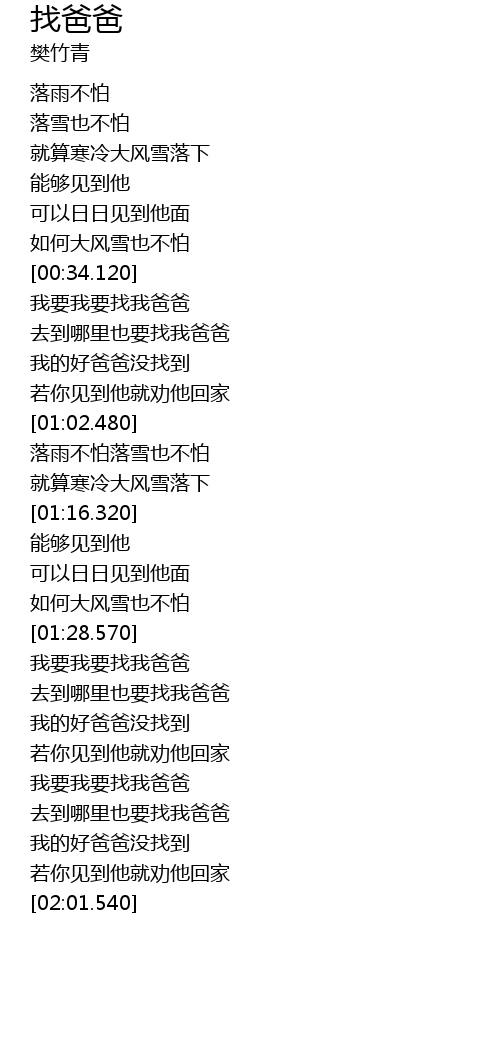 | [01:34.160] | qu dao na li ye yao zhao wo ba ba |