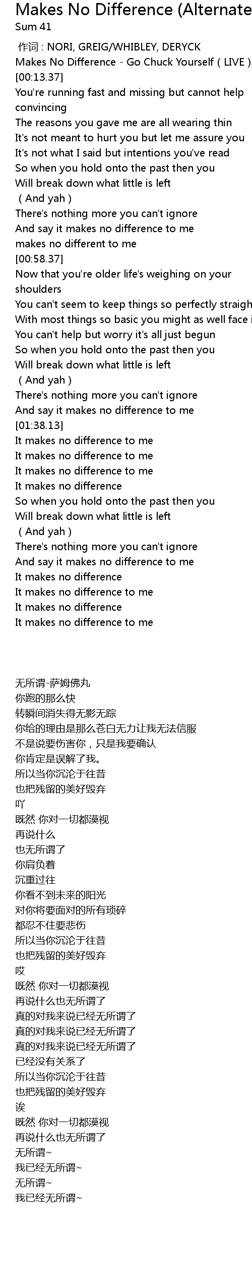 | [00:05.07] | Makes No Difference - Go Chuck Yourself(LIVE) - Sum 41 |
