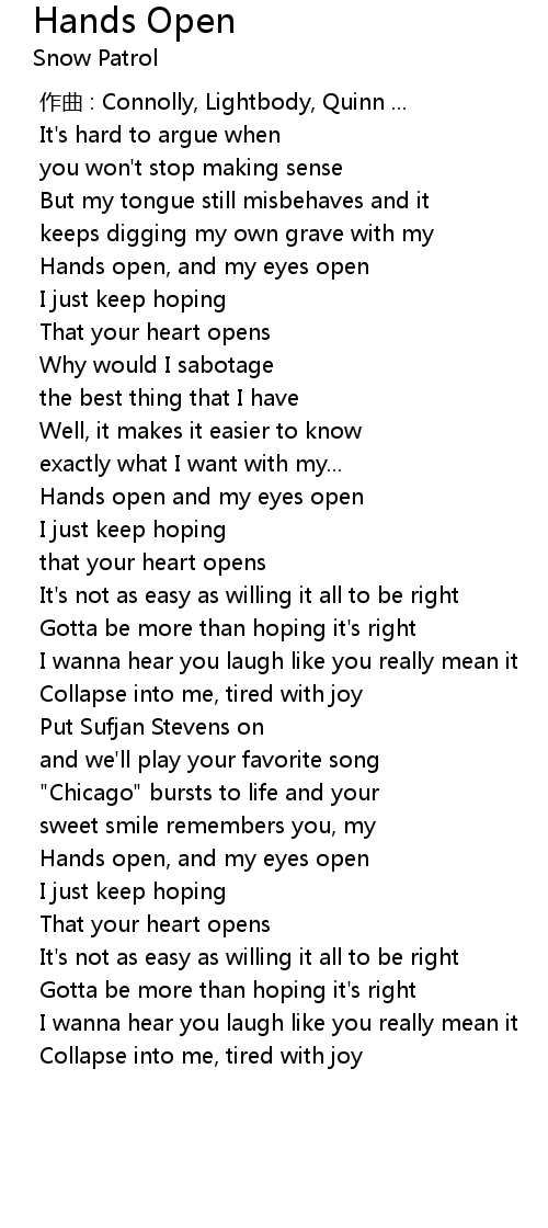 | [00:54.56] | Hands open and my eyes open |