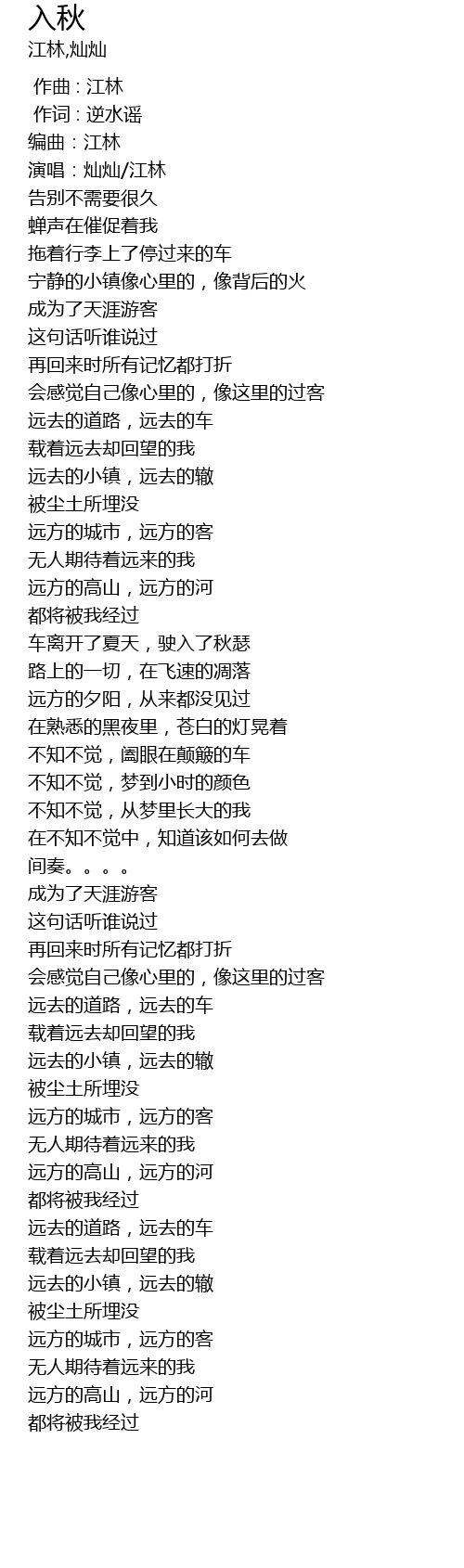 | [01:48.000] | chē lí kāi le xià tiān, shǐ rù le qiū sè |