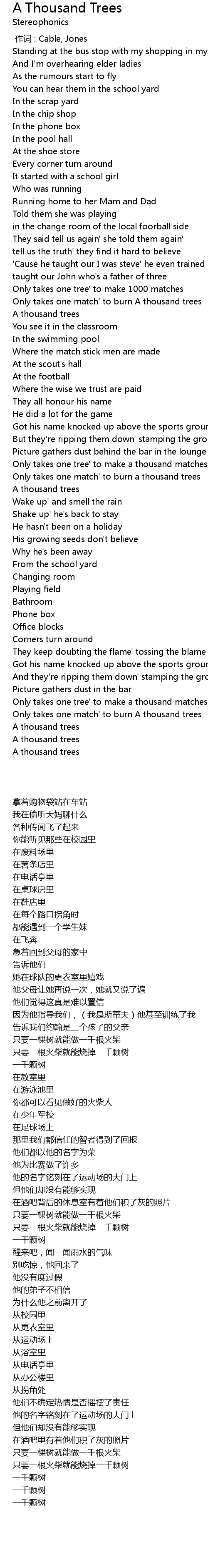 | [02:28.69] | Only takes one tree' to make a thousand matches |