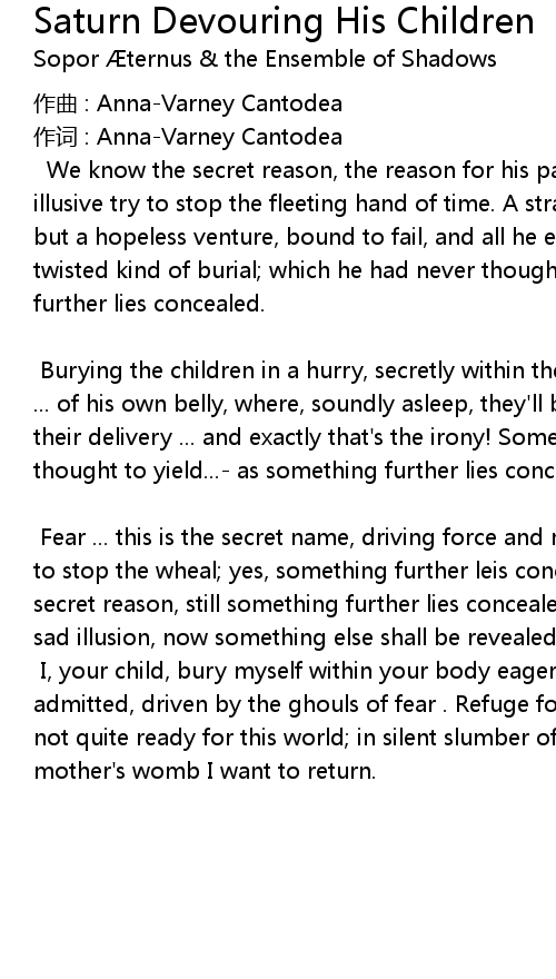 | We know the secret reason, the reason for his parricide the silent and illusive try to stop the fleeting hand of time. A strategy, that will always be but a hopeless venture, bound to fail, and all he ever does conceive is a twisted kind of burial which he had never though to yield... as something further lies concealed. | |