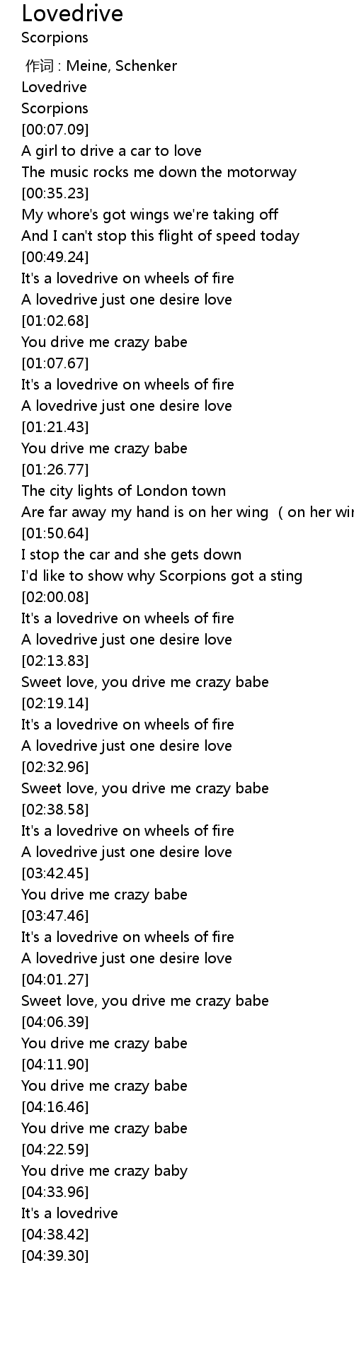 | [00:54.24] | It's a lovedrive on wheels of fire |