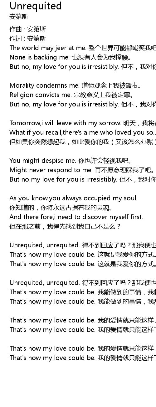 | Unrequited, unrequited. de bu dao hui ying le ma? na wo bian ye bu qiu shen me le. | |