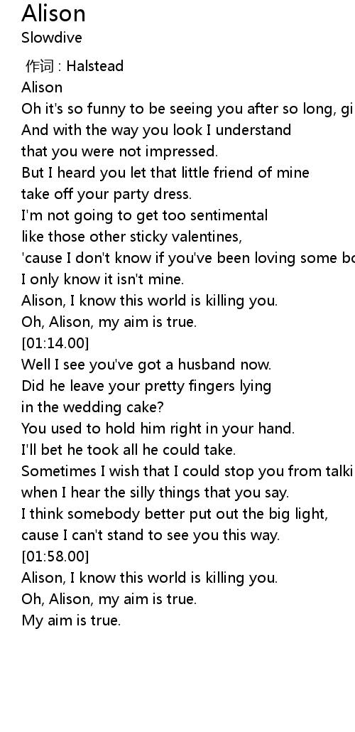 | [02:10.00] | Oh, Alison, my aim is true. |