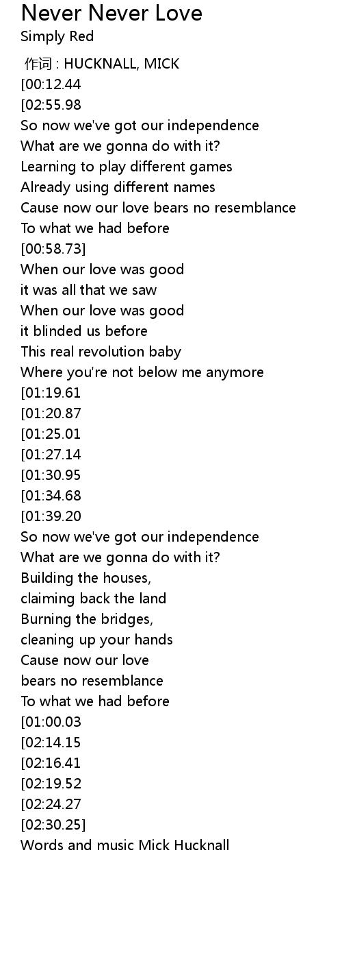 | [02:30.44][01:20.87] | Never never love can never be enough |