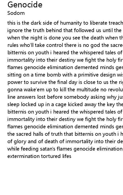 | this is the dark side of humanity to liberate treacherous insanity you can't ignore the truth behind that followed us until the end of time you see the stars when the night is done you see the death when the life is gone confused by the rules who'll take control there is no god the sacred halls of truth that bitternis on youth i heared the whispered tales of glory and of death of immortality into their destiny we fight the holy fire while feeding satan's flames genocide elimination demented minds genocide extermination tortured lifes sitting on a time bomb with a primitive design wish we got the spirit and the power to survive the final day is close to us the right to live refused who gonna wake'em up to kill the multitude no revolution set us free to break the line answers lost before somebody asking why just one bullet left for perpetual sleep locked up in a cage kicked away the key the sacred halls of truth that bitternis on youth i heared the whispered tales of glory and of death of immortality into their destiny we fight the holy fire while feeding satan's flames genocide elimination demented minds genocide extermination tortured lifes the sacred halls of truth that bitternis on youth i heared the whispered tales of glory and of death of immortality into their destiny we fight the holy fire while feeding satan's flames genocide elimination demented minds genocide extermination tortured lifes |
