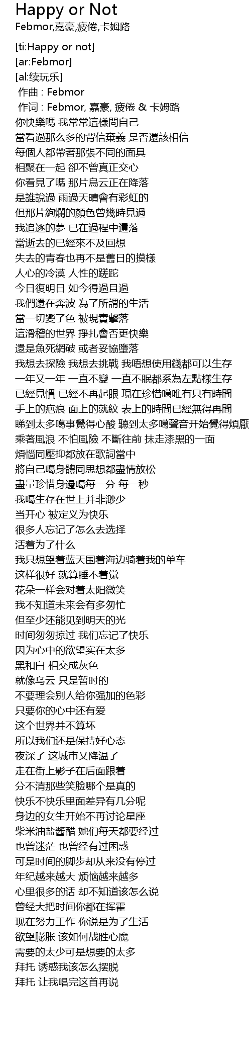 | [00:01.00] | 作词 : Febmor, 嘉豪, 疲倦 & 卡姆路 |