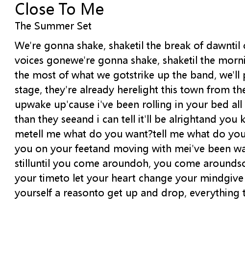 We're gonna shake, shaketil the break of dawntil our lungs give out and our voices gonewe're gonna shake, shaketil the morning comesso we can make the most, the most of what we gotstrike up the band, we'll play a little loudertake the stage, they're already herelight this town from the bottom up, until they wake upwake up'cause i've been rolling in your bed all nightand i know, you're more than they seeand i can tell it'll be alrightand you know, you still look good to metell me what do you want?tell me what do you want?get close to mei wanna get you on your feetand moving with mei've been waiting on youand i'll stand stilluntil you come aroundoh, you come aroundso slow down baby lets just take your timeto let your heart change your mindgive yourself a reasonto give yourself a reasonto get up and drop, everything thats bringing you down |