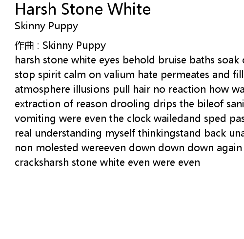 | harsh stone white eyes behold bruise baths soak crying bones everydays appeal to stop spirit calm on valium hate permeates and fills the airicy clouds the atmosphere illusions pull hair no reaction how wasthis done it exists by extraction of reason drooling drips the bileof sanity through the thought lines vomiting were even the clock wailedand sped past two tic tic toc in time in the real understanding myself thinkingstand back unafraid and unaffected stand back non molested wereeven down down down again down here in the cracks face hidden cracksharsh stone white even were even |