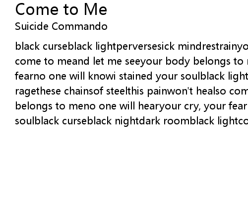 | black curseblack lightperversesick mindrestrainyour fearthis gameis for realso come to meand let me seeyour body belongs to meno one will hearyour cry, your fearno one will knowi stained your soulblack lightdark roomdeath cagemy ragethese chainsof steelthis painwon't healso come to meand let me seeyour body belongs to meno one will hearyour cry, your fearno one will knowi stained your soulblack curseblack nightdark roomblack lightcome to me |