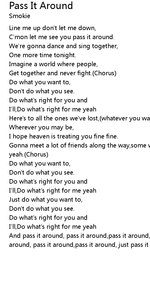 And pass it around, pass it around,pass it around, pass it around,pass it around, pass it around,pass it around, just pass it around |
