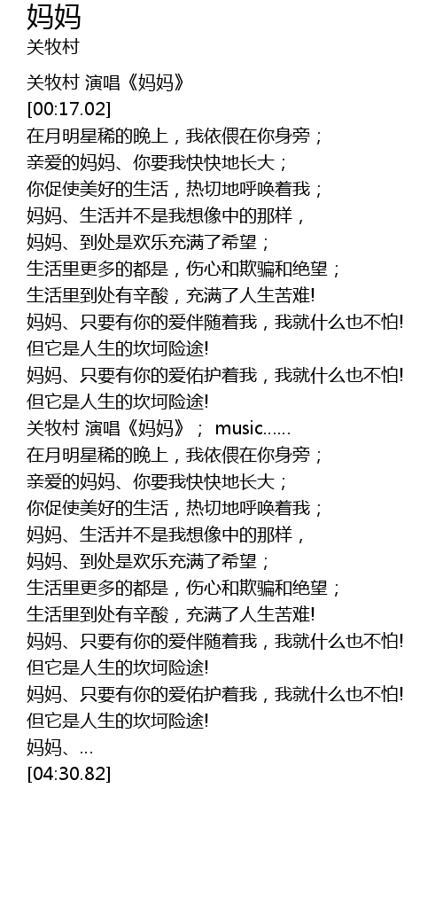 | [02:25.88] | 关牧村 演唱《妈妈》; music…… |