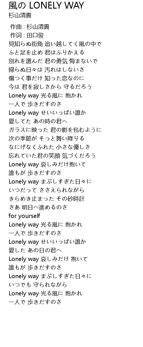 | [01:32.696] | Lonely way 光る風に 抱かれ |