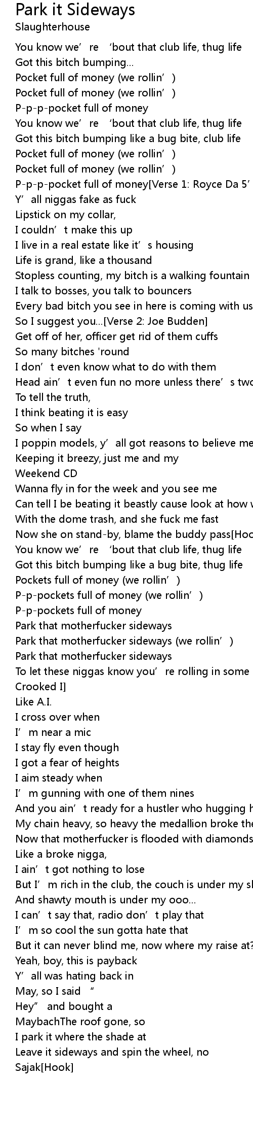 | Park that motherfucker sideways (we rollin’) | |