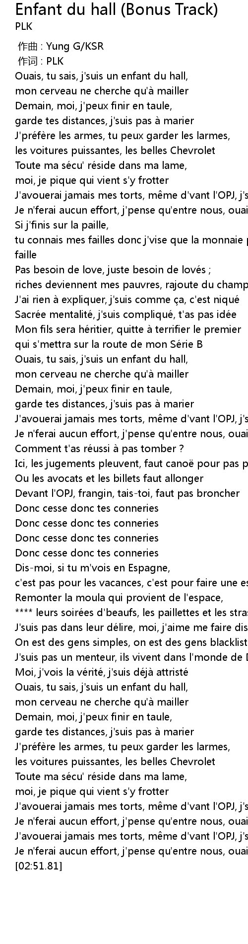 | [00:53.68] | J'ai rien à expliquer, j'suis comme ça, c'est niqué |