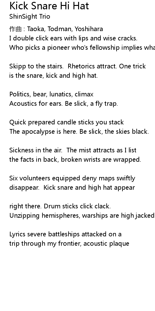 | Song | Kick Snare Hi Hat |