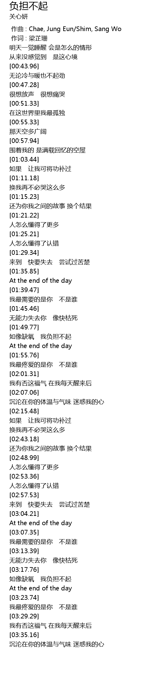 | [03:18.45] | rú xiàng quē yǎng wǒ fù dān bu qǐ |