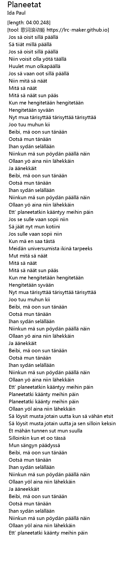 | [01:13.591] | Ett' planeetatkin k ntyy meihin p in |
