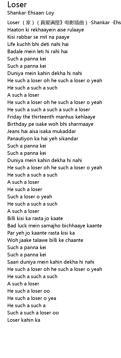 | [00:00.00] | Loser jiā zhēn ài mǎn wū diàn yǐng chā qǔ Shankar Ehsaan Loy |