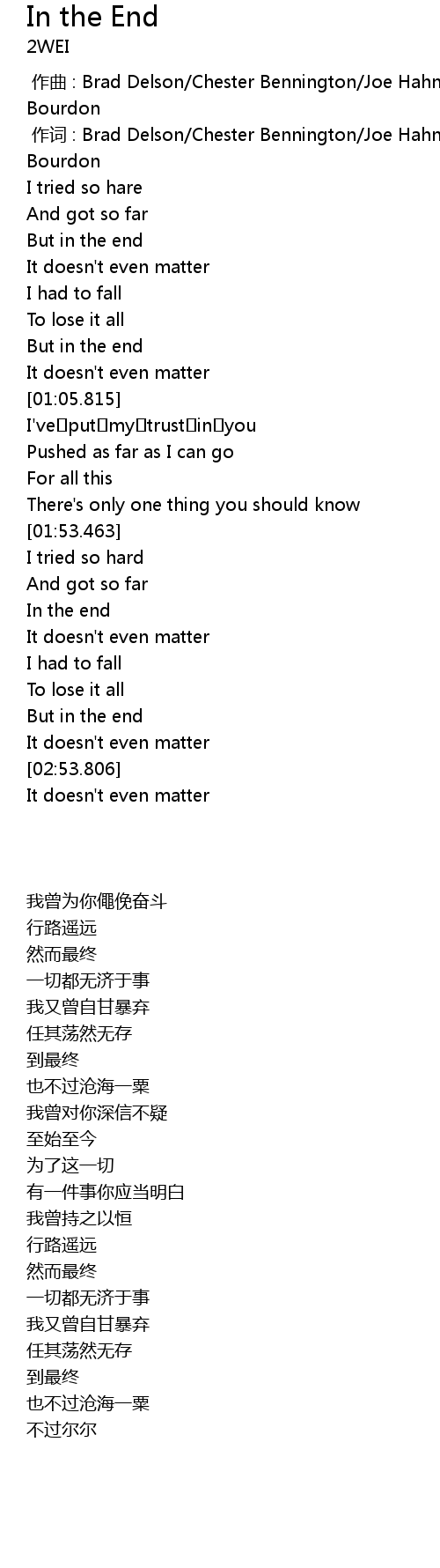 | [00:01.000] | 作词 : Brad Delson/Chester Bennington/Joe Hahn /Mike Shinoda/Rob Bourdon |