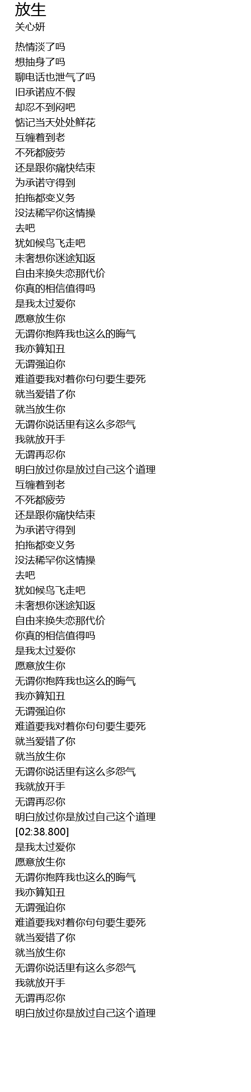 | [02:58.290] | yuàn yì fàng shēng nǐ |