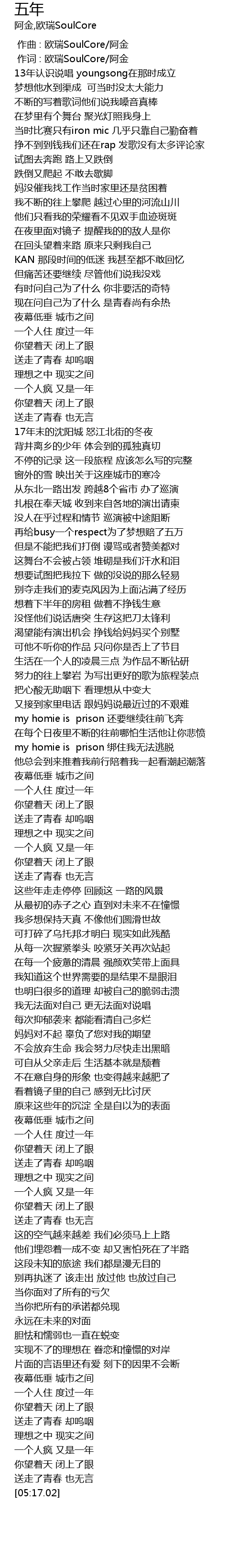 | [00:01.000] | 作词 : 欧瑞SoulCore/阿金 |