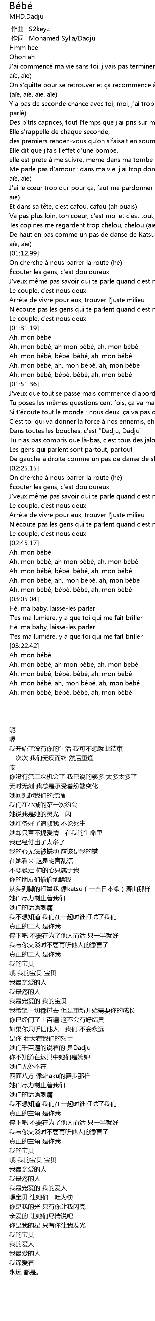 | [03:01.23] | Ah, mon bé bé, bé bé, bé bé, ah, mon bé bé |