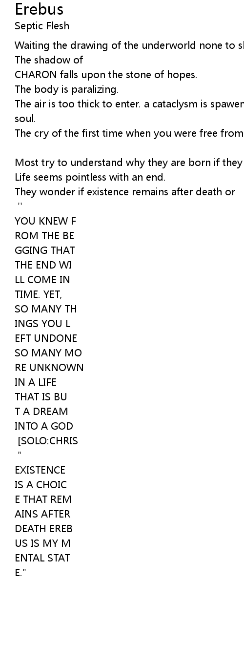S DREAM." [SOLO:SOTIRIS] [SOLO:CHRIS] [Chorus:] Most try to understand why they are born if they must die. Life seems pointless with an end. [CHARON:] " |