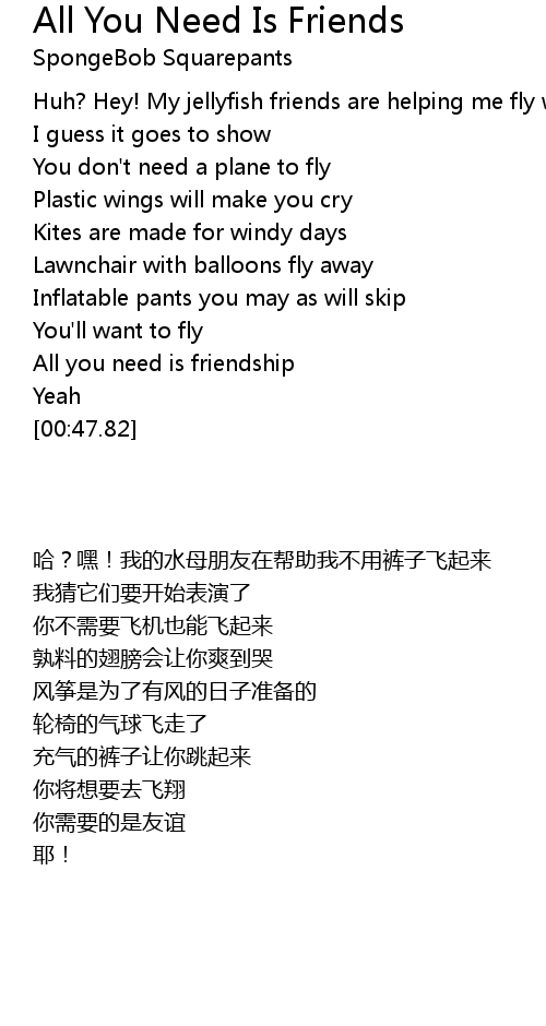 | [00:02.77] | Huh? Hey! My jellyfish friends are helping me fly without pants |