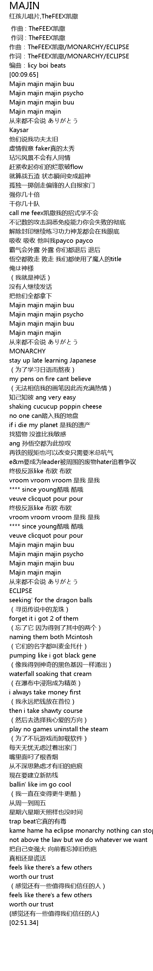 | [00:05.14] | 作词:TheFEEX凯撒/MONARCHY/ECLIPSE |
