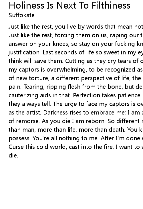 Just like the rest, you live by words that mean nothing, values no one needs. Just like the rest, forcing them on us, raping our thoughts. Try to find the answer on your knees, so stay on your fucking knees. Murder needs no justification. Last seconds of life so sweet in my eyes. Hearing words they think will save them. Cutting as they cry tears of corruption. The urge to face my captors is overwhelming, to be recognized as the artist that I am. Excitement of new torture, a different perspective of life, the body can endure so much pain. Tearing, ripping flesh from the bone, but death does not come yet, cauterizing aids in that. Perfection takes patience. You knew we'd find out, they always tell. The urge to face my captors is overwhelming, to be recognized as the artist. Darkness rises to embrace me; I am a soulless monster with a lack of remorse. As you die I am reborn. So different now - I am unstoppable. More than man, more than life, more than death. You kneel before me, this power I possess. You're all nothing to me. After I'm done with you, death will follow. Curse this cold world, cast into the fire. I want to watch us burn. Watch us die. |