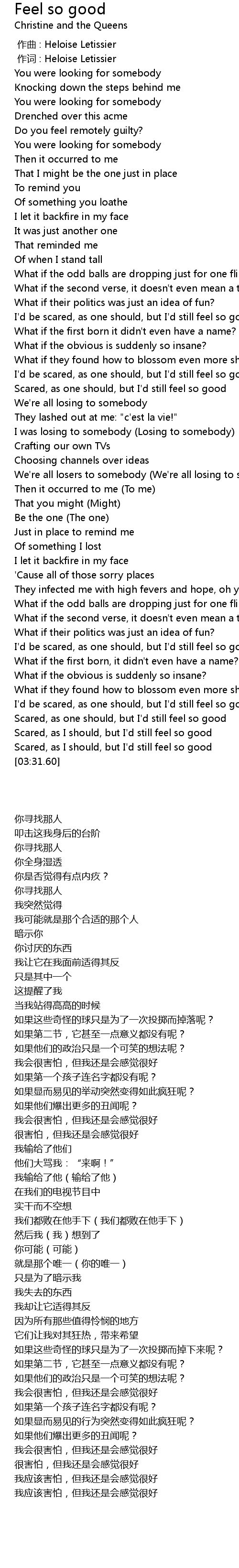 | [03:20.46] | Scared, as I should, but I' d still feel so good |