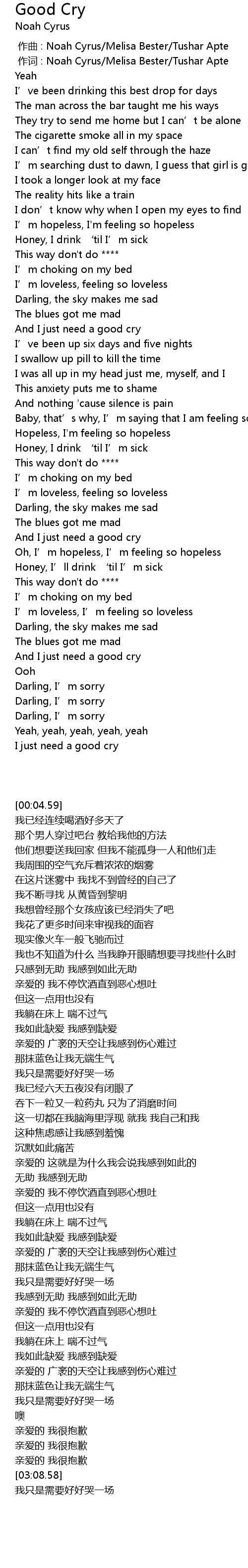 | [00:00.000] | zuo qu : Noah Cyrus Melisa Bester Tushar Apte |