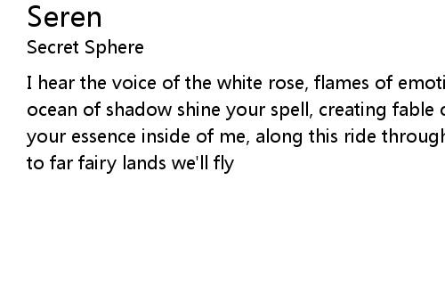 | I hear the voice of the white rose, flames of emotion dance before my eyes, in ocean of shadow shine your spell, creating fable of dreams, take my hand, plunge your essence inside of me, along this ride through destiny, queen of the stars, to far fairy lands we'll fly |