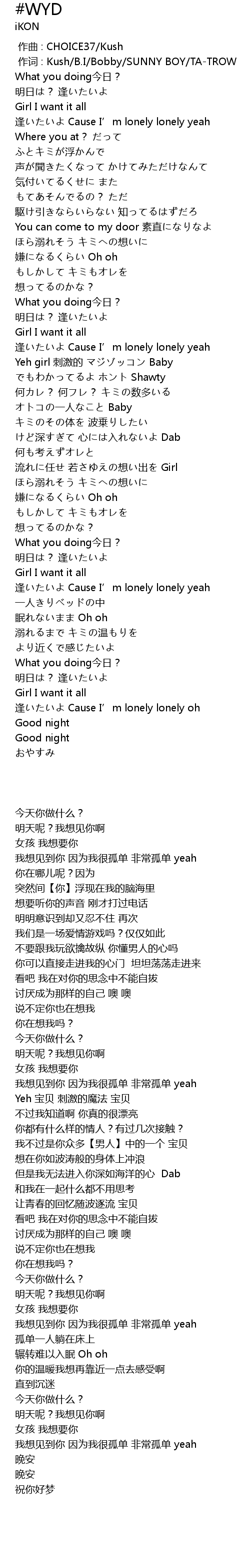| [00:01.000] | 作词 : Kush/B.I/Bobby/SUNNY BOY/TA-TROW |