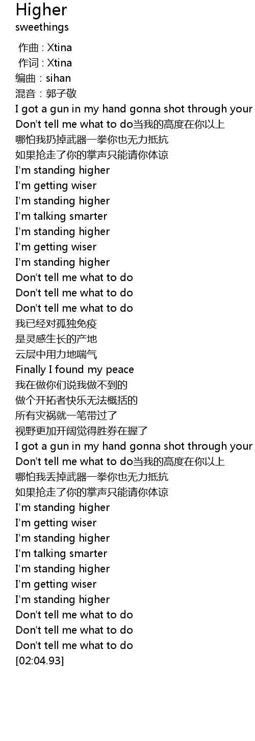 | [00:13.23] | Don' t tell me what to do dāng wǒ de gāo dù zài nǐ yǐ shàng |