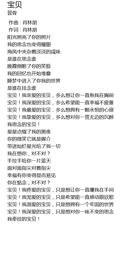 | [02:31.36] | bǎo bèi! wǒ shēn ài de bǎo bèi, zhǐ shì xiǎng duì nǐ yī wèi bù biàn de sī niàn |