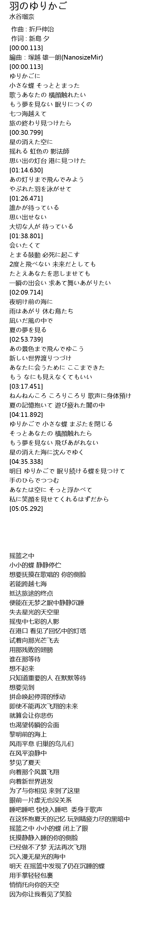 | [04:35.642] | 明日 ゆりかごで 眠り続ける蝶を見つけて |