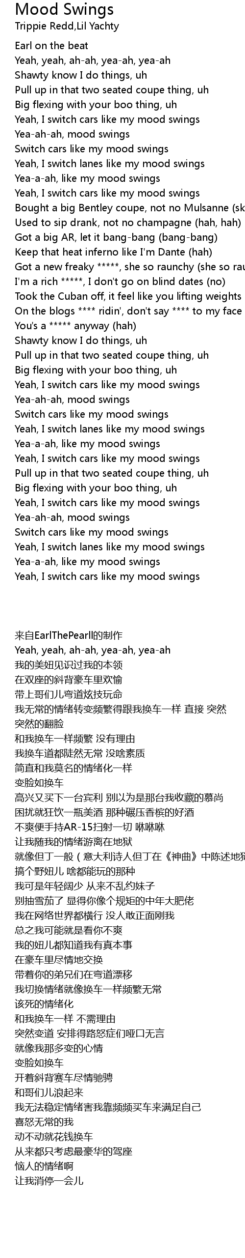 Yeah, I switch cars like my mood swings |